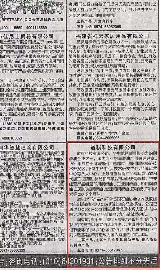 道騏科技有限公司總經理王碩表示:“誠信是企業立足之本,質量是企業生命之基。道騏科技有限公司從創建至今,一直堅持誠信經營,致力打造用戶放心品牌。在質量方面更是嚴格要求,公司旗下產品均符合美國石油協會API及歐洲汽車制造商協會ACEA所制定的行業標準。公司已通過ISO9001-2008國際質量管理體系認證。”王碩認為:“只有繼續秉持誠信為本、質量至上的理念,才能踏踏實實的走好每一步,市場才會越走越寬。”