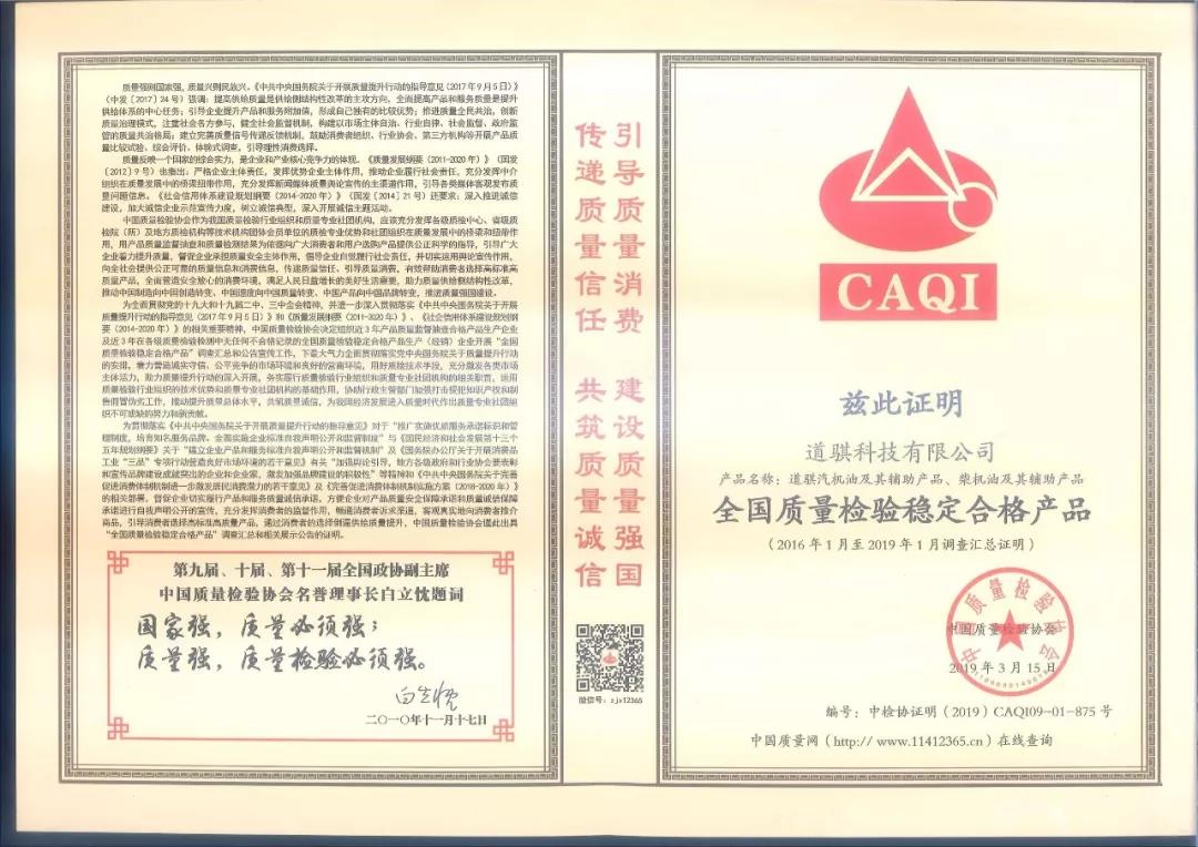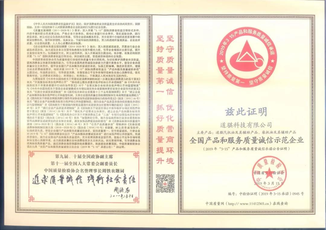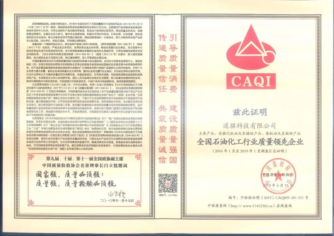 活動期間,還頒發了“全國產品和服務質量誠信示范企業”等多項證書。其中,華中地區頗具影響力的潤滑油企業、國內專業的潤滑油產供銷運營商道騏科技有限公司一舉斬獲“全國質量檢驗穩定合格產品”“全國產品和服務質量誠信示范企業”“全國石油化工行業質量領先企業”三項榮譽。