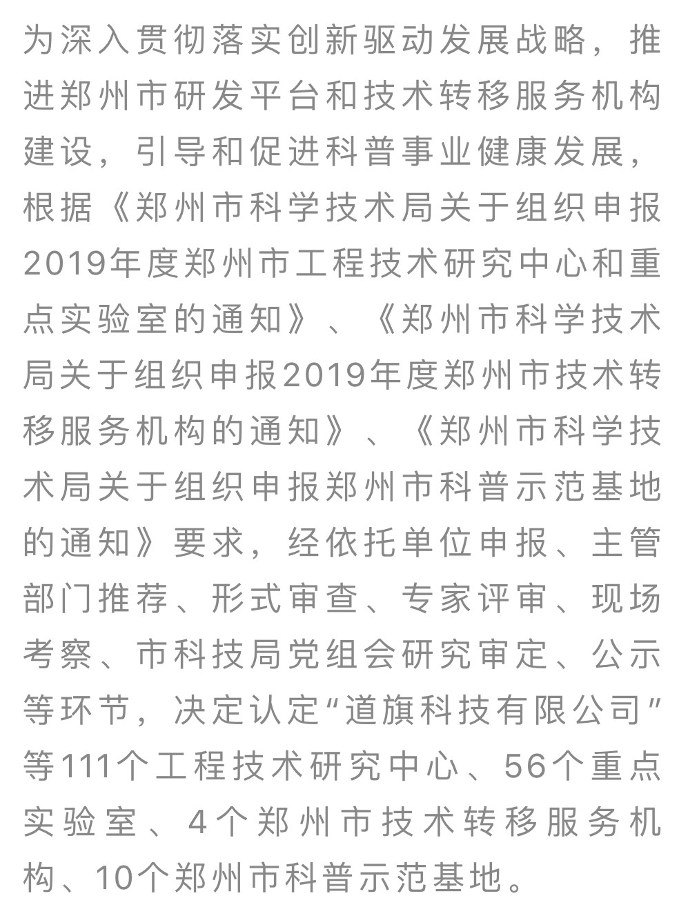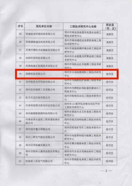 近日,鄭州市科學技術局在官網上發布了《關于認定2019年度鄭州市工程技術研究中心、重點實驗室、技術轉移服務機構、科普示范基地的通知》。在“鄭州市工程技術研究中心”的名單上,道騏科技被認定為2019年度鄭州市合成潤滑材料工程技術研究中心。